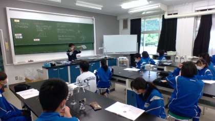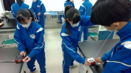前の時間の斜面を下る台車の運動を振り返ってみて、今日はその角度を垂直にした場合の「自由落下運動」の実験をしました。結果の記録テープの長さがとても長く、落下するスピードの速さを考えることができました。力の向きと運動の変化のようすについてもまとめることができました。