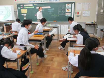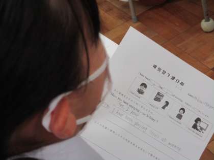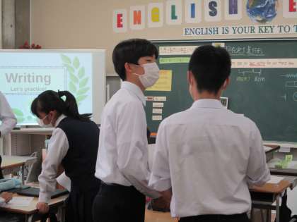 現在まで続いている動作などについての現在完了形を使った表現の練習をしています。友達と楽しそうに会話練習をしていました。