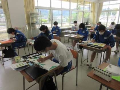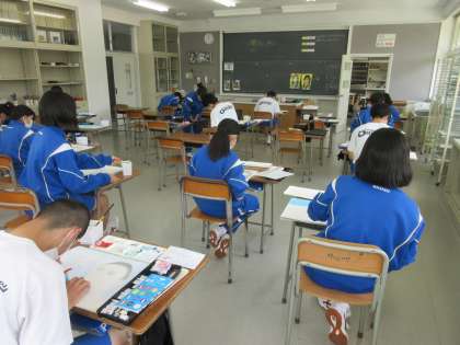 6月1日(水) 3年生(美術)「自画像」 公開日 2022/06/01 更新日 2022/06/01 できごと 丁寧に描き進めている自画像も,いよいよ色塗りで仕上げに向かっています。多くの面積を占める背景の色づくりに苦心しながら,集中して取り組んでいました。
