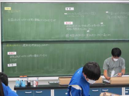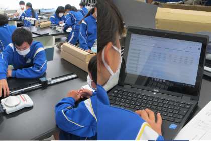 6月2日(木) 3年生(理科)「運動エネルギー」 公開日 2022/06/02 更新日 2022/06/02 できごと 運動エネルギーの大きさは何と関係しているのか?これまでに学習した位置エネルギーのことをもとにジャムボードで予想を出し合い、実験に取り組んでいます。実験データはスプレッドシートに入力してクラスで共有し考察に生かします。
