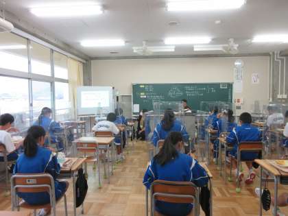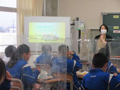 鬼石中学校では,長く「お弁当の日」が続いています。2学期始業式,1年生にとってははじめての「お弁当の日」になります。今日は,藤岡市給食センターの栄養士の先生から,お弁当作りのポイントを学びました。自分の体や運動量にちょうどいい量のお弁当箱を使うこと,主食とおかずのバランスや,色のバランスを考えること,衛生面にも注意すること。お弁当作りってけっこう大変そうですが。自分で作ってみると,まわりの人たちや食材への感謝の気持ちを感じられそうですね。
