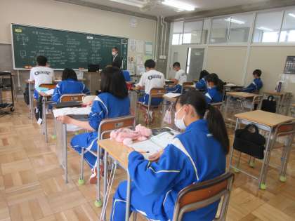 6月7日(火) 3年生(数学)「根号を含むいろいろな式の計算」 公開日 2022/06/08 更新日 2022/06/08 できごと 3年生の数学は,根号を含む数や式を学習しています。今日は,乗法や除法について考えました。大きい数字のまま計算することもありですが,素因数分解してから計算することもよさそうだと気付きました。