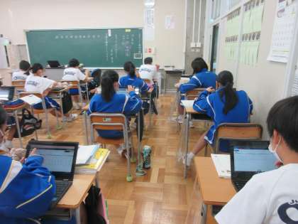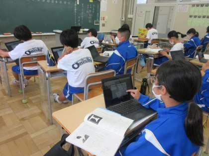6月7日(火) 1年生(国語) 「ちょっと立ち止まって」 公開日 2022/06/08 更新日 2022/06/08 できごと 1年生の国語は,説明文の読解が続いています。「ダイコン」の話の次は「だまし絵」の話です。見方によって全く違うものに見えてくる不思議な絵や図の話はとても興味深いです。 まずは,段落のまとまりに着目して文章の構成を考えます。タブレットで,自分の考えを送り合い,互いの考えを見比べています。案外いろいろな意見が出て,ここから検討のはじまりです。