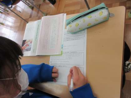 はじめに「いのちの音」という詩を読み,「心臓が鼓動している=生きている」を感じました。それから,出産を写真に撮ることをライフワークにしているフォトグラファーの文章を読み,「生きているのはあたりまえではない」だから「生きよう」というメッセージを受け取りました。2年生の中には弟や妹が生まれてくる場面に立ち会っているお兄さんお姉さんがたくさんいました。そのときの様子を一緒に共有しながら,みんな「生きている」ことや家族や周りの人への感謝の気持ちを口にしていました。