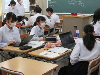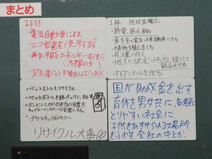 6月8日(水) 3年生(社会)「持続可能な社会に向けて」 公開日 2022/06/08 更新日 2022/06/08 できごと 持続可能な社会に向けて、自分たちにできることは何だろうか?インターネットで調べながら、班ごとにテーマを決めて検討しています。環境保全や地球温暖化対策などの視点で、具体的な方策を発表しました。