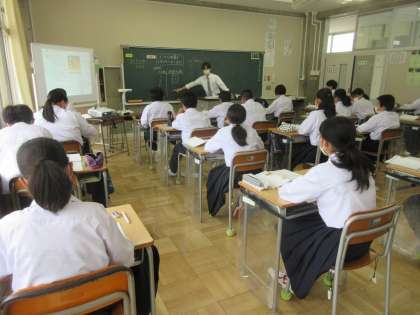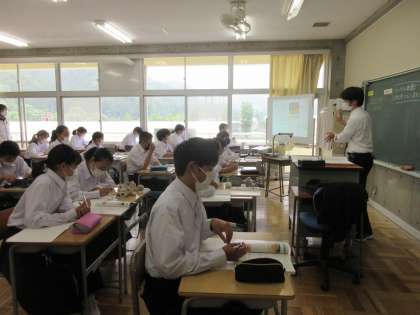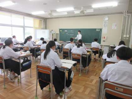 6月15日(水)1年生(数学)「いろいろな数量を文字を使った式で表そう」 公開日 2022/06/15 更新日 2022/06/15 できごと 1年生の数学は,今日から教育実習生の授業が始まりました。問題文を読んで文字を使った式で表します。分かりやすく,表や図にして考えて式にします。先生からの丁寧な質問に1年生もよく考えて答えていました。