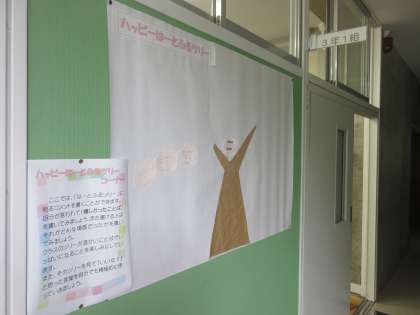人権集中学習期間の生徒会の活動として,言われてうれしかった言葉を書いた花で木をいっぱいにする「ハッピーはーとふるツリー」に取り組みます。各教室の廊下にツリーが登場し,3年生のツリーには早くも花が咲いていました。心も教室もあたたかく明るくなりますように。