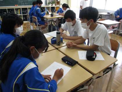 「ねえねえ、Aさんて自己中でイヤだよね、そう思わない?」と友達に言われたときにどう返すか?どんなことに気をつける必要があるのか?といったことについて、資料を基に、自分の考えを出し合った後、グループでよりよい返し方を考えました。初発の感想として、「なんでそんなこと、いちいち人に言うのかな?」「面倒くさいこという人だなぁ」など、否定的な考えの生徒がほとんどでした。誰だって、人の悪口を聞いて気持ちのよい人はいませんよね。しかし、こういったことが全くないのかといえば、そうではないと思います。実際にそういった場面に出くわしたときに、適切に判断し発言できるようにしてほしいです。