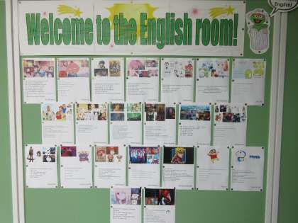 英語室の掲示板には,2年生が作成した"My Hero"がありました。それぞれのキャラクターへの熱い思いがこめられています。