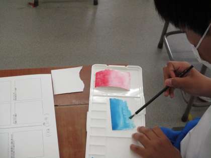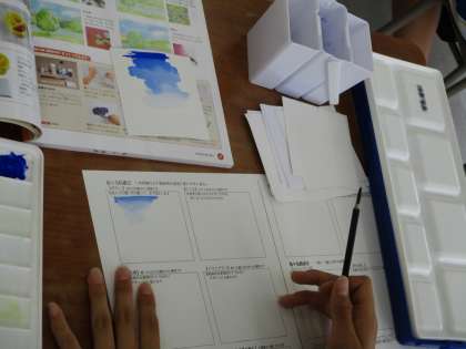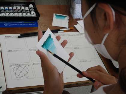 6月24日(金) 1年生(美術)「いろいろな技法」 公開日 2022/06/24 更新日 2022/06/24 できごと 静物画の色塗りを始める前に、色塗りの様々な技法について学習しています。例えば、水色の絵の具を使って 濃 → 薄 のように塗ると、まるで空のようになりました。