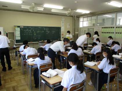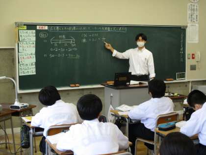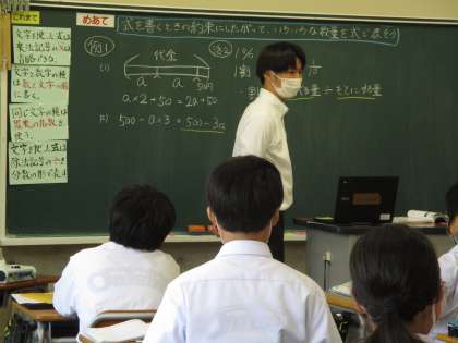 6月28日(火) 1年生(数学)「文字式」 公開日 2022/06/28 更新日 2022/06/28 できごと 教育実習生の研究授業でした。これまでに学習してきた「文字式を表すときのきまり」を用いていろいろな数量の問題について、文字を使って式で表していきます。質問などに丁寧に対応しながら、たくさんの問題を解きました。