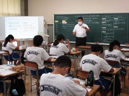 7月12日(火) 2年生(社会)「九州地方」 公開日 2022/07/12 更新日 2022/07/12 できごと 九州地方には火山が多いです。ということは温泉も多いです。最近ではそれだけでなく、地熱発電などの再生可能エネルギーも注目されています。生徒は、教師の発問に積極的に発言しながら授業に取り組んでいました。