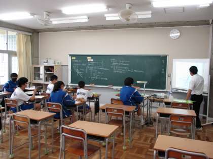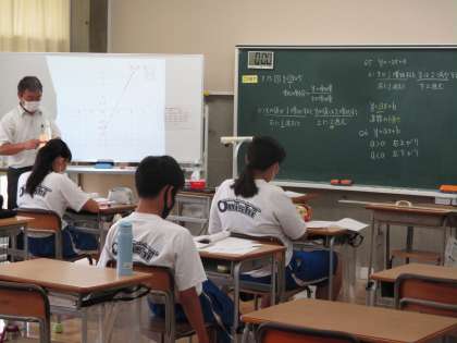 7月14日(木) 2年生(数学)「1次関数」 公開日 2022/07/25 更新日 2022/07/25 できごと 今日は1次関数のグラフの書き方を学習していました。2点が決まれば、あとは定規で線を引くだけです。やり方さえ分かれば、皆スイスイできます。