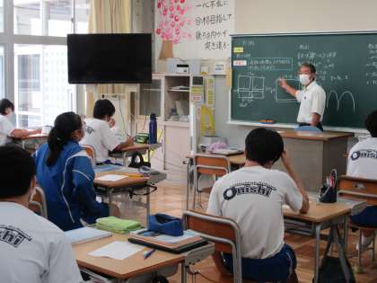 9月1日(木) 3年生(数学)「二次方程式の利用」 公開日 2022/09/01 更新日 2022/09/01 できごと 二次方程式を使って図形や数の問題に挑戦しています。数学科では、1クラスを二つに分けて指導していますので、生徒の実態などに合わせて課題を設定しています。生徒は、相談したり、教え合ったりしながら学習を進めています。