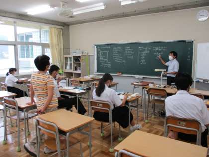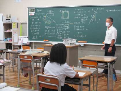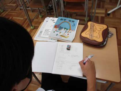 9月5日(月) 3年生(数学)「2次方程式の利用」 公開日 2022/09/05 更新日 2022/09/05 できごと 今日から、チャレンジウィークがスタートしました。いつも元気な2年生がいないので、校舎の中が少し静かな気がします。 そんな中、3年生の数学科では、2次方程式を使って図形や数の問題に挑戦しています。少しずつ問題の難易度がレベルアップしています。生徒は、相談したり、教え合ったりしながら学習を進めています。