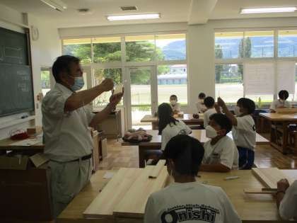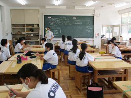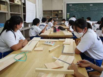 9月6日(火) 1年生(技術)「さしがねの使い方」 公開日 2022/09/06 更新日 2022/09/06 できごと 材料取りのためのけがきをする前に、道具として使用する差し金の特徴や使い方について学習していました。生徒にとってはほとんどなじみのない道具のようで、皆真剣に聴いていました。