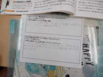 9月9日(金) 1年生(社会)「産業発展と人口増加が急速に進む南アジア」 公開日 2022/09/09 更新日 2022/09/09 できごと これまでに、中国や韓国、マレーシアの文化や産業について考えてきました。今日は、それを踏まえて、インドの産業について考えました。インドでは、近年急速に情報産業技術が発展しています。その理由について、グループで話し合い、全体で発表し、深めていました。
