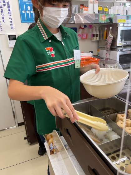セブンイレブン神川渡瀬店では、おでんが今日からスタートするようです。おでんの具を丁寧に形を崩さないよう扱っていました。レジの接客も上達していました!