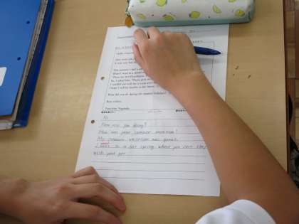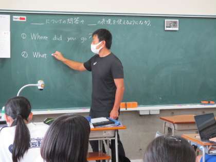 9月13日(火) 2年生(英語)「E-mailの返信を書こう」 公開日 2022/09/13 更新日 2022/09/13 できごと What did you do during the summer holidays ? あなたは夏休みに何をしましたか?どんな夏休みを過ごしましたか?というメール文に対する返信を書いていました。 〜へ行きました。そこで〜をしました。とても〜だったです。 などという英文を頑張って書いていました。