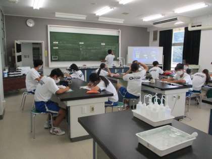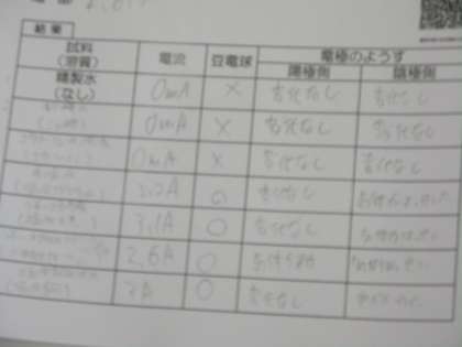 9月16日(金) 3年生(理科)「電気が流れる水溶液」 公開日 2022/09/16 更新日 2022/09/16 できごと いろいろな水溶液に電気が流れるか流れないかという実験をしました。その結果を基にした考察の時間です。電気が流れる水溶液、つまり電解質のものと、非電解質のもののそれぞれの共通点などを考えました。