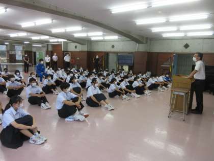 朝礼では,3連休に行われた藤岡多野中体連秋季大会を終えて,各部の部長から報告と振り返りがありました。新チームになってはじめての大会で,よいプレーもたくさん出ましたが,まだまだ練習不足だったことや試合でのつめの甘さがあったことが反省として挙げられました。秋から冬をどう過ごすかが,春のよい結果につながります。今日からの取組に期待しています。