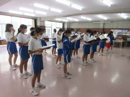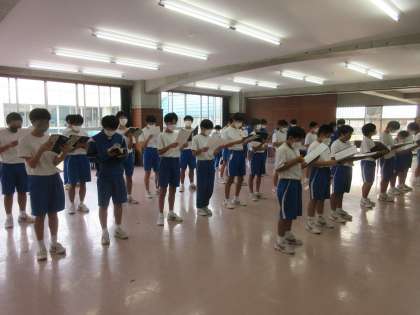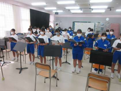 9月20日(火) 全校合唱練習 公開日 2022/09/20 更新日 2022/09/20 できごと 10月26日の桜華祭(文化祭)に向けて,準備が進められています。 各クラスから合唱の声が響き始めています。今年度は,各クラスの課題曲「COSMOS」を全校合唱としても歌います。3年生が中心になって各パートごとに練習しました。まだ歌詞も音程も自信がなさそうですが,練習のたびに声も心も一つになっていけると思います。“歌う鬼中”です。
