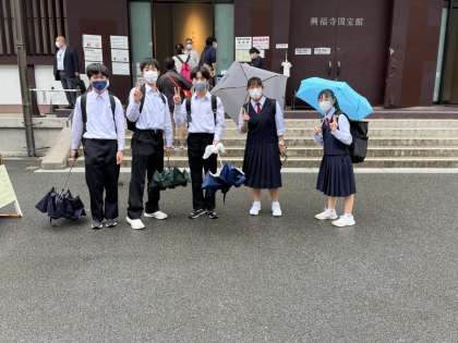 10月10日(月) 修学旅行1日目(奈良編) 公開日 2022/10/10 更新日 2022/10/10 3年修学旅行 興福寺国宝館には続々と各班が到着しています。社会の資料集に出ている国宝が沢山あります。気づいたかな? 次の見学地は、法隆寺です。