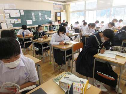 3年生が修学旅行中のためか,鬼石中は静かな朝を迎えています。出欠確認をしたら,いつものように朝読書です。1年生は読書の好きな人が多いようで,すぐに本やタブレットで読書を始めていました。担任と副担任も一緒に読んでいます。