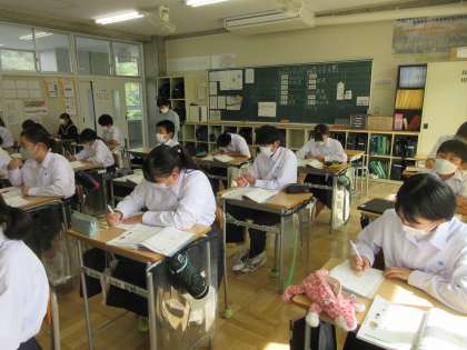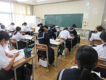 10月11日(火) 1年生(数学)「1次方程式を使って解決しよう」 公開日 2022/10/11 更新日 2022/10/11 できごと 1年生は「1次方程式の利用」の学習を進めています。今日の問題は,先に出発したAさんに後から出発したBさんが追いつく,定型の文章題です。小学校の「み・は・じ」を思い出してから,速さ,時間,道のりを図や表にして時間をX分にして考えました。文を読んでいるだけでなく,図や表で整理すると見えてくるものがあります。方程式にすることができたようです。