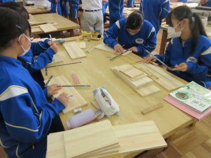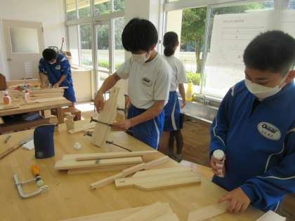 10月11日(火) 1年生(技術科)「木工品を製作しよう」 公開日 2022/10/11 更新日 2022/10/11 できごと 1年生は,身の回りで使う木工品製作の学習中です。同じ物を製作する仲間と協力しながら,着々と作業を進めています。完成が楽しみです。