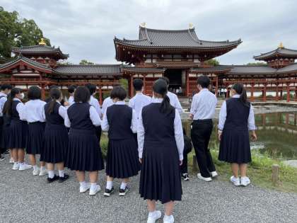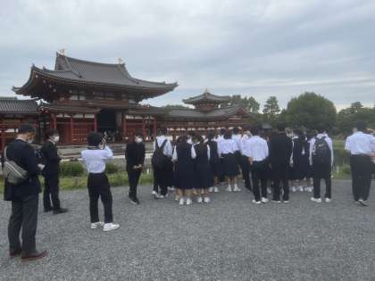 10月12日(水) 修学旅行3日目(宇治伏見編) 公開日 2022/10/12 更新日 2022/10/12 3年修学旅行 とうとう、最終見学地の平等院鳳凰堂に来ました。屋根の鳳凰からその名で呼ばれていますが、阿弥陀堂が本当の名前でそうです。