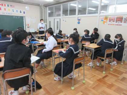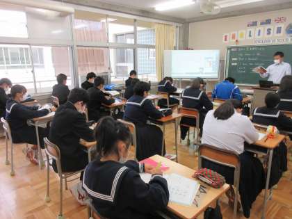 10月13日(木) 2年生(英語)「あこがれの職業を発表しよう」 公開日 2022/10/13 更新日 2022/10/13 できごと あこがれの職業についてのスピーチを聞いて,どんなことをどんなふうに伝えているかを考えます。モデルスピーチでは“rakugo performer落語家”が出てきました。英語の落語も人気だそうです。 次は,2年生もスピーチの準備を始めます。どんな職業が発表されるでしょうか。
