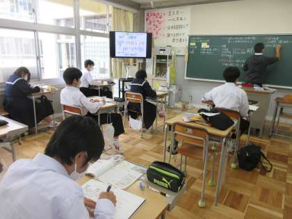 10月17日(月) 3年生(社会)「行政の仕組みと内閣」 公開日 2022/10/17 更新日 2022/10/17 できごと これまでに,国会が議決した法律や予算に基づいて政策を実行することを行政ということを学びました。国の行政は首相を中心に内閣や各省庁が分担して行います。3年生は,内閣を身近なものと捉え,次々と質問をしながら学びを進めていました。