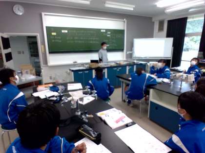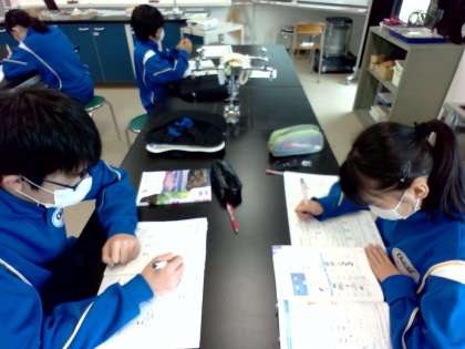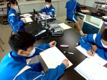 10月18日(火) 2年生(理科)「回路の電流」 公開日 2022/10/18 更新日 2022/10/18 できごと 前回、豆電球の前後で流れる電流の大きさは変わらないことを学びました。今回は、豆電球2つを用いての問題です。直列回路と並列回路の各点で流れる電流の大きさにちがいはあるのでしょうか。根拠をもとに予想を立てて全体交流しました。次回は実験です。 授業 2年