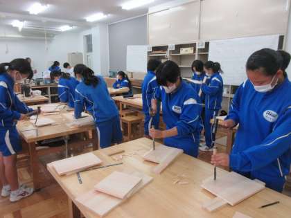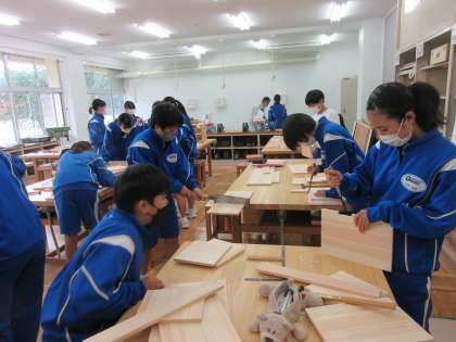 10月18日(火) 1年生(技術科)「木工実習」 公開日 2022/10/18 更新日 2022/10/18 できごと 本立て,マガジンラック,飾り棚,の中から1つを選択して製作中です。だんだん形が見えてきました。同じものを製作する仲間と協力しながら丁寧に取り組んでいます。
