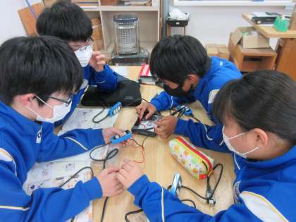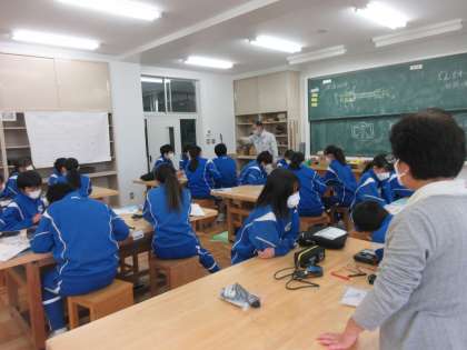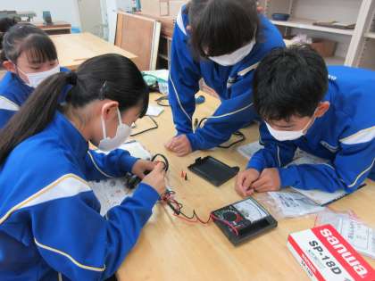 10月18日(火) 2年生(技術科)「導通試験」 公開日 2022/10/18 更新日 2022/10/18 できごと 電気回路に断線がないかどうかなど回路の導通状況を調べる試験をしました。テスターの使い方や見方を学習したあと,各自の電源コードを調べてみました。不良なしでした。