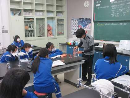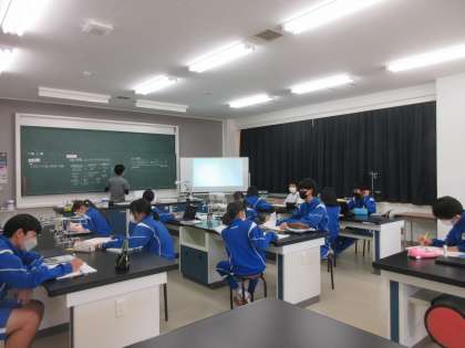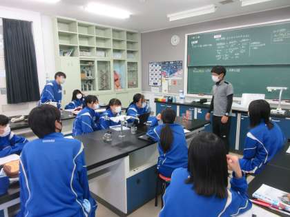 10月19日(水) 3年生(理科)「電池とイオン」 公開日 2022/10/20 更新日 2022/10/20 できごと 金属板を水溶液に入れるとイオン化することを学習しています。そうした化学エネルギーを電気エネルギーに変換する装置が電池です。その例として「ボルタ電池」をつくってみました。モーターにつなぐとくるくると回り,感嘆の声があがりました。
