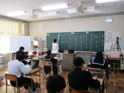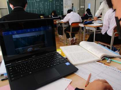 視点を決めて、「人工知能との未来」「人間と人工知能と創造性」の二つの文章の読み比べをしています。ある生徒は前の時間の板書画像を参考にしながら考えていました。学びのつながりを大切にしていますね。