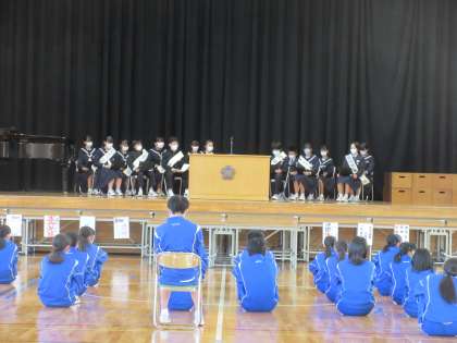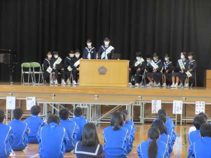 生徒会役員選挙にさきがけて,立候補者と責任者による立ち会い演説が行われました。いずれの立候補者も責任者もしっかりした演説で,他の生徒のみんなも真剣に耳をかたむけていました。