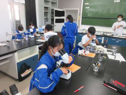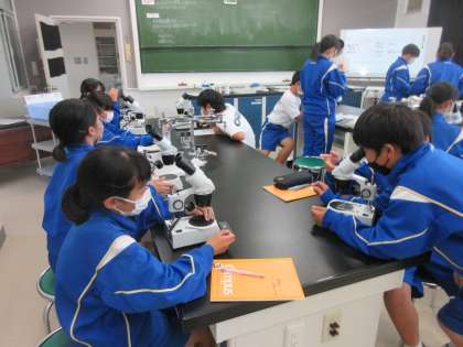 10月20日(火) 1年生(理科)「水溶液から溶質を取り出して調べよう」 公開日 2022/10/20 更新日 2022/10/20 できごと 硝酸カリウムの水溶液や食塩水から溶質を取り出す実験です。取り出した溶質を顕微鏡を使って観察していました。ピントをしっかり合わせると規則正しい結晶が見え,嬉しそうな声が聞こえてきました。