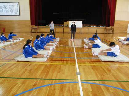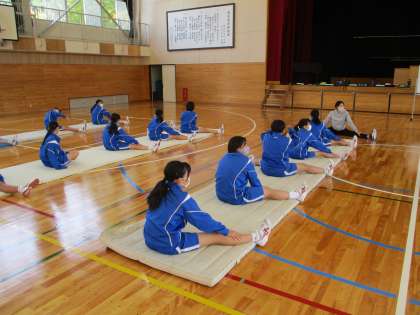 11月7日(月) 1年生(保体)「マット運動」 公開日 2022/11/07 更新日 2022/11/07 できごと 1年生は今日からマット運動に入ります。これまでに身に付けた、あるいは経験した技を確認し、今日はまず体を慣らすことから始めます。マットの上で柔軟体操をしましたが、体の柔らかい生徒もいる一方で、苦手な生徒は、「イテテテテ」と声を上げながら、楽しそうに取り組んでいました。