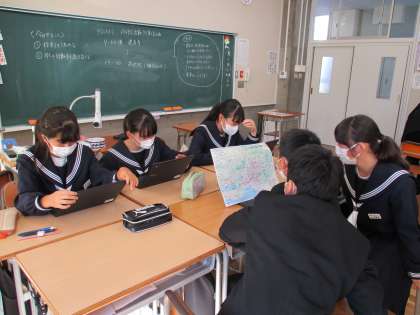 11月8日(火) 2年生(総合的な学習の時間)「鎌倉校外学習に向けて」 公開日 2022/11/08 更新日 2022/11/08 できごと 12月の鎌倉校外学習の計画を立てています。個々で調べてきたことをもとに班で相談して見学場所を決めています。タブレットと紙の地図と,両方を上手に使って話し合っています。