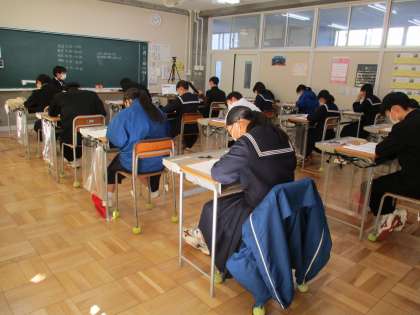 11月9日(水) 3年生 第6回実力テスト 公開日 2022/11/09 更新日 2022/11/09 できごと 3年生の実力テストも第6回目になりました。三者面談を終えて,希望の進路への道筋が見えてきて,やる気が高まっています。みんな集中して取り組んでいます。廊下にはカバンがきれいに並べられていました。