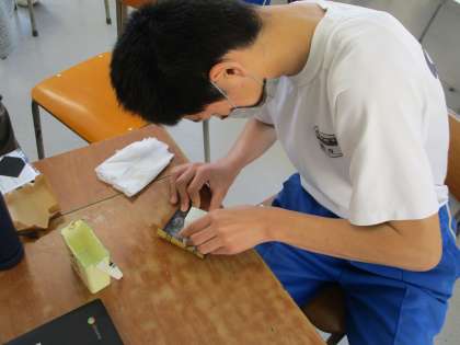 11月11日(金) 3年生(美術)「篆刻」 公開日 2022/11/11 更新日 2022/11/11 できごと いよいよ中学校生活最後の制作に取りかかっています。最初の作業として、篆刻の材料となる石を平らに削っていました。結構腕に疲労がたまるようですね。
