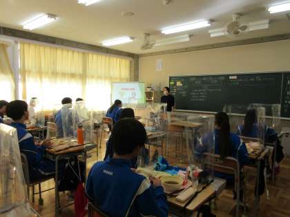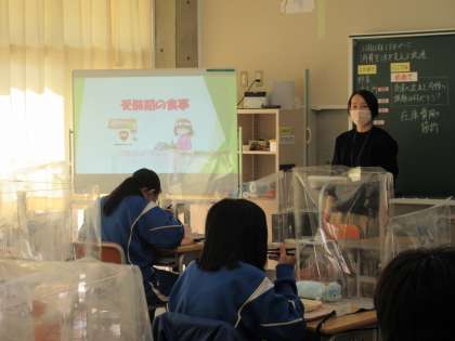 いよいよ受験期を迎える3年生。藤岡市給食センターの栄養士の先生から「受験期の食事」についてお話がありました。栄養バランスを考えた食事が大切であること,中でも,脳の栄養になる炭水化物,免疫力を高めるタンパク質やビタミンA・Cなどをとるとよいこと,また,ストレスを軽くするためにフルーツや少しのお菓子など甘いものがよいこと,などいろいろ教えていただきました。しっかり食べて全力で受験に臨めるとよいと思います。