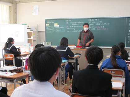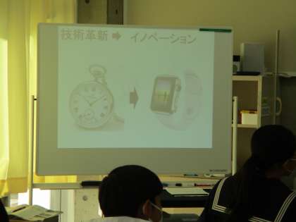 11月14日(月) 3年生(社会)「生産活動と企業」 公開日 2022/11/14 更新日 2022/11/14 できごと 私たちの生活を豊かにしてくれる様々な商品やサービスは、ほとんどの場合、各企業によって開発されるなどしています。いわゆるイノベーションの繰り返しによって、昔では考えられなかったような便利なものが生まれています。スマートウォッチ、車の自動運転などもそうです。生徒は、教師の示す資料を興味深そうに見ながら、イノベーションによって開発された技術の成果と課題について考えていました。