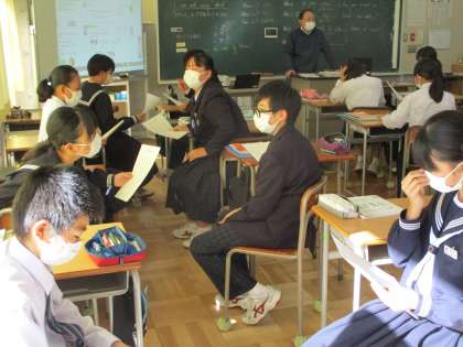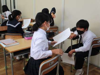 11月16日(水) 1年生(英語)「whichを使って尋ねる」 公開日 2022/11/18 更新日 2022/11/18 できごと 「黒と白、どちらの色が好きですか?」「テニスとサッカー、どちらをやりたいですか?」など、どちらかについて尋ねる際には[which]を使います。モデルとして、教師とALTのやりとりを見てから、さあ、ペアで会話の練習です。