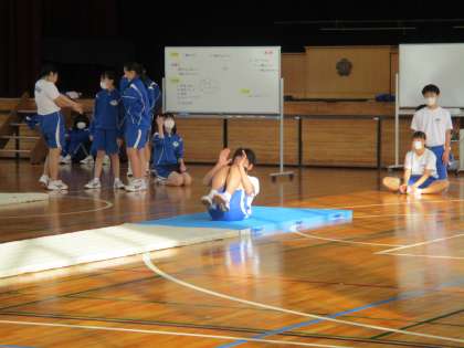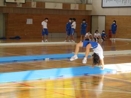 11月17日(木) 3年生(保体)「マット運動」 公開日 2022/11/18 更新日 2022/11/18 できごと 3年生のマット運動は、実技テストをしていました。技の難易度は、各生徒が選択して技を披露しています。頑張った一人一人に温かい拍手が送られていました。
