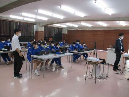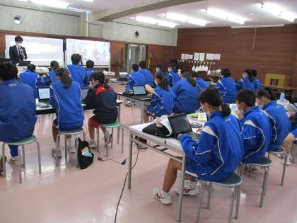 上野中学校とオンラインでつないで交流授業を行っています。3時間の計画で,グループごとに節電プランを提案します。