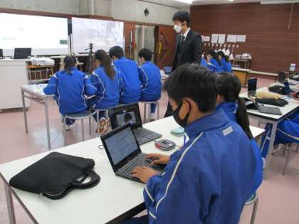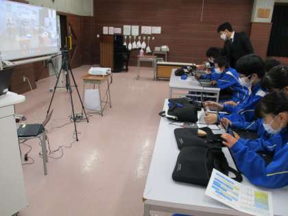11月17日(木) 2年生(理科)「節電プランを提案しよう」 公開日 2022/11/18 更新日 2022/11/18 できごと 上野中学校とオンラインでつないで交流授業を行っています。3時間の計画の第2回目は,前回まとめたアイデアをプレゼンテーションするための準備をしました。スライドをつくったり,発表の分担をしたり,鬼石中と上野中で離れているけれど,まるで目の前にいるように話ができます。活発に意見交流が行われました。